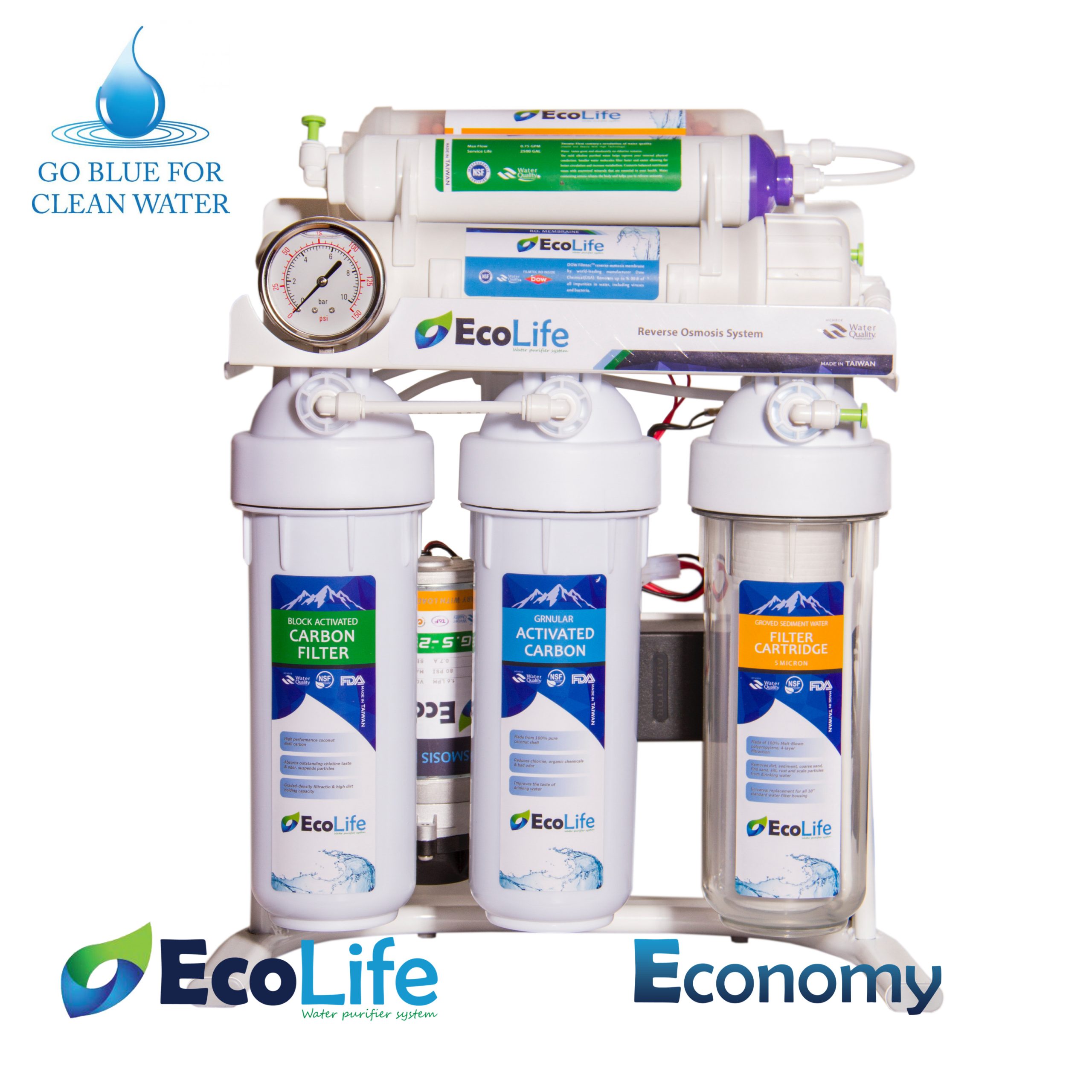 فروشگاه تصویه آب مرکزی واردکننده و پخش کننده دستگاه تصفیه آب اکولایف در ایران است. مدل Economy برای افرادی که قصد خرید تصفیه آب تایوانی با قیمت مناسب و کیفیت مناسب دارد گزینه مناسبی می باشد. البته توجه داشته باشید که تصفیه آب اکولایف مدل Economy نسبت به بسیاری از برندهای موجود در بازار ایران دارای کیفیت بسیاربالاتری است مدل Premium از بهترین قطعات و باکیفیت ترین قطعات روز دنیا ساخته شده و با توجه به کیفیت بالا دارای قیمت بالاتری هم نسبت به مدل اکونومی می باشد که شما می توانید توضیحات کامل را در صفحه تصفیه آب اکولایف مدل premium مشاهده نمایید. اکولایف جزو کمپانی هایی است که توانسته استانداردهای روز دنیا مانند Water Quality ,FDA,NSF را کسب کند، این استانداردها به این معنی می باشد که قطعات به کار رفته در دستگاه و فیلترها تحت نظارت سازمان های جهانی تهیه و تولید شده است. پمپ دستگاه ساخت کشور تایوان دارای توان خروجی بسیار بالا و در عین حال بسیار بی صدا می باشد. مخزن به کار رفته در این مدل دارای توان ذخیره ۴ گالن آب می باشد و دارای کیفیت مناسبی است. هوزینگ های به کار رفته Food Graid بوده و با آب ترکیبات شیمیایی انجام نمی دهد. درون جعبه دستگاه تمامی قطعات و متعلقات نصب و شیربرداشت موجود است و برای نصب دستگاه نیاز به هیچ قطعه اضافه دیگری ندارید. فیلترهای به کار رفته در تصفیه آب اکولایف مدل Economy از بهترین مواد اولیه ساخته شده و توان حذف ریزترین ذرات موجود در آب را نیز دارد تا آب تصفیه شده دارای بهترین کیفیت باشد.