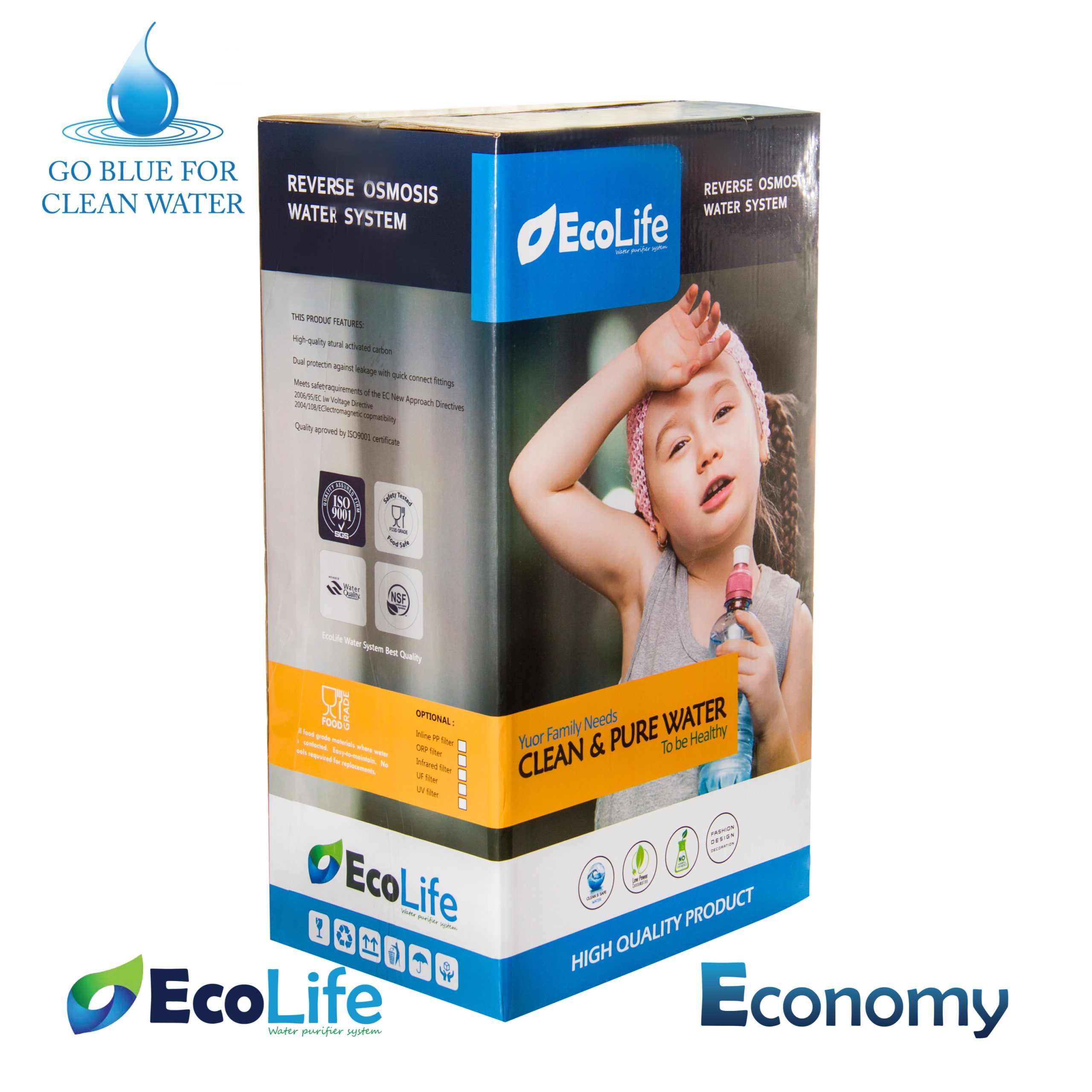 تصفیه آب اکولایف مدل Economy از سیستم اسمزمعکوس برای تصفیه کردن آب استفاده می نماید این دستگاه قادر است تا 250 لیتر آب تصفیه شده در طول روز تولید نماید. همچنین فیلتر ممبران اورجینال به کار رفته در دستگاه با هولوگرام اصالت بوده و قادراست تا ریز ترین آلاینده های موجود در آب شهری را تا قطر یک هزارم میکرون تصفیه نماید. عمربالای قطعات از خصوصیت اصلی تصفیه آب اکولایف است، این شرکت با به کارگیری بهترین قطعات توانسته در این موضوع بسیار خوش نام باشد و قطعات دستگاه دارای عمر بسیار بالایی نصب به رقبا هستند. فیلتر مرحله اول:  دارای قابلیت حذف ذرات ریز موجود در آب تا قطر 5 میکرون مانند شن و ماسه و … فیلتر مرحله دوم: کربن فعال یا کربن پودری که دارای کیفیت بسیار بالایی میباشد و به منظور بهبود کیفیت آب و حذف بوی بد آب و کلر فیلتر مرحله سوم: این فیلتر نقش مهمی در پیش تصفیه دارد و با تکمیل مراحل فیلتراسیون و حذف جامدات موجود در آب تا قطر یک میکرون باعث میشود تا این ذرات به فیلتر ممبران نرسد و در نهایت موجب افزایش عمر ممبران میشود. فیلتر مرحله چهارم : ممبران استفاده شده در دستگاه از باکیفیت ترین نوع خود میباشد که قادر است آلاینده هایی مانند نیترات، نیتریت، مواد شیمیایی، ویروس، باکتری و.. را از آب حذف نماید فیلتر مرحله پنجم: از کربن ۱۰۰٪ گیاهی ساخته شده و این کربن در کیفیت آب تصفیه شده تاثییر بسیار بالایی دارد فیلتر مرحله ششم: با اضافه نمودن املاح معدنی مورد نیاز بدن به آب باعث میشود تا املاحی که بدن نیاز دارد مانند سدیم، کلسیم، منیزیم و.. به آب در نهایت اضافه شود فیلتر مرحله هفتم: ORP با قلیایی کردن آب موجب بالا بردن PH آب شده و برای افرادی که مشکلات گوارشی دارند بسیار توصیه میشود.